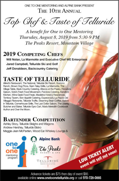 Telluride’s One to One San Miguel Mentoring Program announces its 10th annual fundraiser, Top Chef & Taste of Telluride. The event takes place Thursday, August 8, 5:30 – 9 p.m. at the Peaks Resort & Spa, Mountain Village.