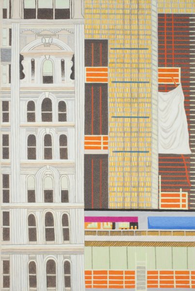 In this new series, Jacquette directly examines the rapidly changing structure of the city, paying close attention to minute architectural details, and often including construction apparatuses and equipment. Because she lives in East Chelsea, the artist easily takes her inspirations from the continual changes in her ‘hood.
