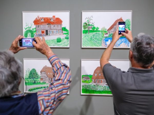 David Hockney is one of the most influential British artists of the 20th century, best known for his serial paintings of swimming pools, portraits of friends, and verdant landscapes – like that surrounding his new studio in Normandy. The third floor of Pace’s global headquarters is dedicated to “La Grande Cours, Normandy,” an exhibition of new drawings by Hockney which depicts the arrival of spring in the French countryside. The show marks the first body of work created by the artist at his new space, after which the show is titled.