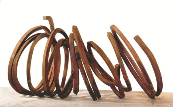 The five abstract “Indeterminate Lines” consist of spiraling rolls of steel that sit, balanced or stacked in novel compositions, on the gallery floor. As well as manifesting the concept of the line as an object—playful, antic, and unpredictable—the series from which these works emerge explores and demonstrates the limits of material resistance.