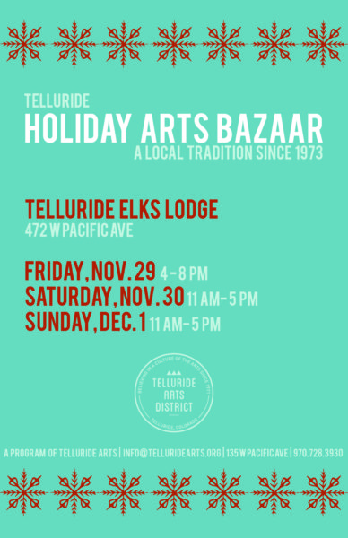 Telluride Arts’46th Annual Holiday Arts Bazaar is a weekend-long, annual shopping spree featuring the work of regional artists, which takes place at the Elks Lodge, 472 West Pacific. The fun starts with a Grand Opening on Friday, the day after Thanksgiving, November 29, 4 – 8 p.m. Shopping continues Saturday, November 30, 11 a.m. – 5 p.m.; and Sunday, December 1, 11 a.m. – 5 p.m.