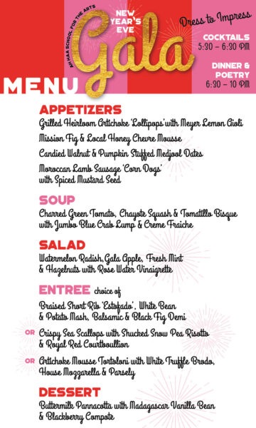 The all-inclusive Gala evening begins at 5:30pm on December 31, with hors d’oeuvres and cocktails followed by a four-course sit-down dinner catered by chef Josh Klein (Bouille Catering/Sidework/Smuggler).