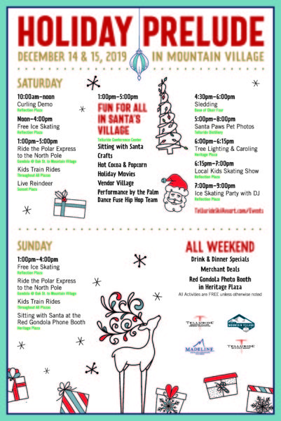 Holiday Prelude, Dec. 14 and Dec. 15, is a collaborative effort between Telluride Mountain Village Owners Association, the Town of Mountain Village, Telluride Ski & Golf Company, and local merchants to transform Mountain Village into the regional destination for holiday fun and activities.
