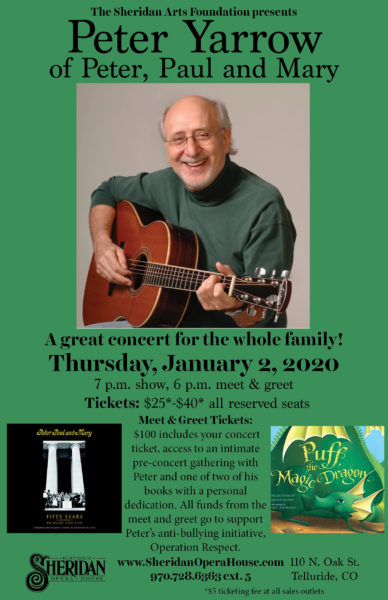 Telluride’s Sheridan Arts Foundation presents the legendary Peter Yarrow of Peter, Paul & Mary on Thursday, January 2, 2020, at the historic Sheridan Opera House.