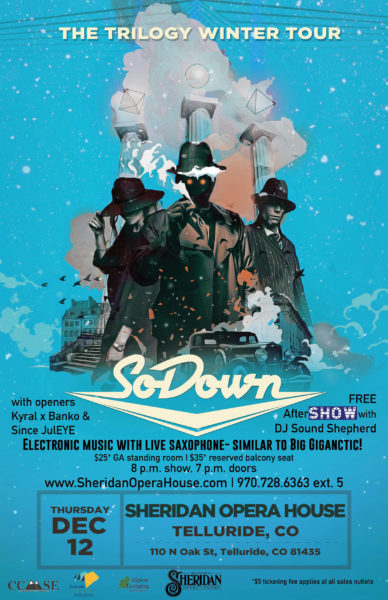 The Sheridan Arts Foundation presents SoDown live in concert at Telluride’s Sheridan Opera House on Thursday, December 12, 2019, with support from Kyral x Banko and Since JulEYE. Free AfterSHOW with DJ Sound Shepherd in the SHOW Bar immediately following the Main Stage performance. Tickets are $25 general admission on the floor; $35 reserved seats in the balcony. (A $5 ticketing fee is charged at all ticket outlets.)
