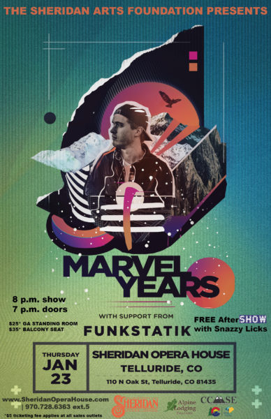 The Sheridan Arts Foundation presents Marvel Years live in concert at Telluride’s historic Sheridan Opera House on Thursday, January 23, 2020, 8 p.m.,with opening support from FunkStatik and a free AfterSHOW with Snazzy Licks. Tickets are $25 for standing room on the main floor; $35 for reserved balcony seats. (A $5 ticketing fee always applies.) Doors, 7 p.m.
