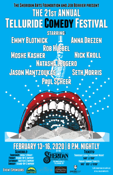 The Sheridan Arts Foundation & Jeb Berrier present the 21st annual Telluride Comedy Fest, February 13-16, 2020, 8 p.m. Tickets on Thursday, Locals’ Night, 8 p.m., are $40/$50; Friday-Sunday, $45/$55/$130. (Fees apply.)