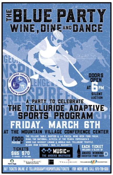 TASP’s Blue Party, one of the organization’s main annual fun-raisers, is booked into the Telluride Conference Center in Mountain Village on Friday, March 6, 6 p.m. Tickets are $65 in advance at Telluride Adaptive Sports; $70 at the door. All proceeds benefit the Adaptive Program’s scholarship fund for low-income participants with disabilities. For more information or to get involved please contact TASP at 970-728-5010 or go to www.tellurideadaptivesports.org.