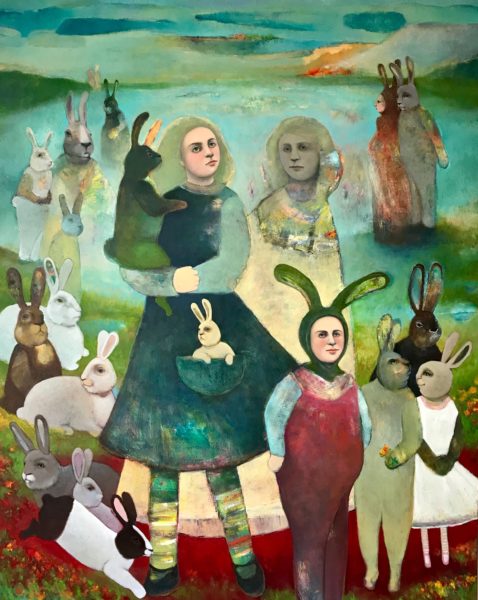 Each piece starts out life as an abstraction, with the focus on simple colors and marks, a phase that informs the finished piece much like Rorschach inkblot tests or the simple visions we see when looking at clouds. That process enables Richardson to develop a dialog within the physical act of painting. Next comes a flurry of questions and answers which develop organically into a narrative: a fable is realized.