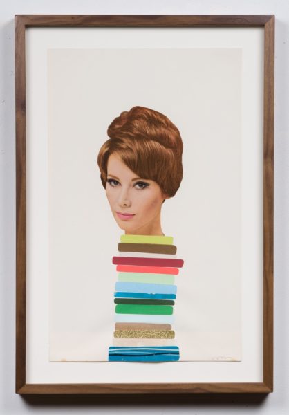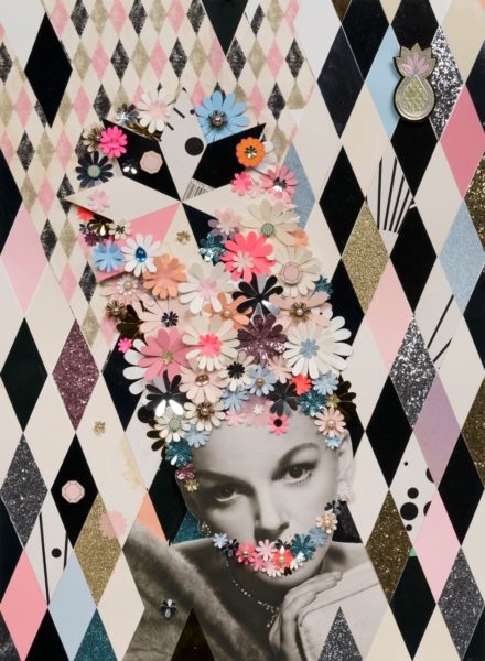 Using collage fashioned from found images drawn from films, advertising, and magazines, as well as amusement park and travel memorabilia from the 1950’s and 1960’s, O’Connor plays with color and scale, juxtaposing candy-colored surfaces that are almost sickly sweet with papers sampled from vintage record covers. The contrast of sparkling rays and bright neon against weathered, dull tones acts as a metaphor for the dualities that coexist in our society.