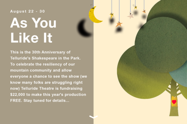 This is the 30th Anniversary of Telluride’s Shakespeare in the Park. To celebrate the resiliency of the mountain community and allow everyone a chance to see the show, Telluride Theatre is fundraising $22,000 to make this year’s production free for all.