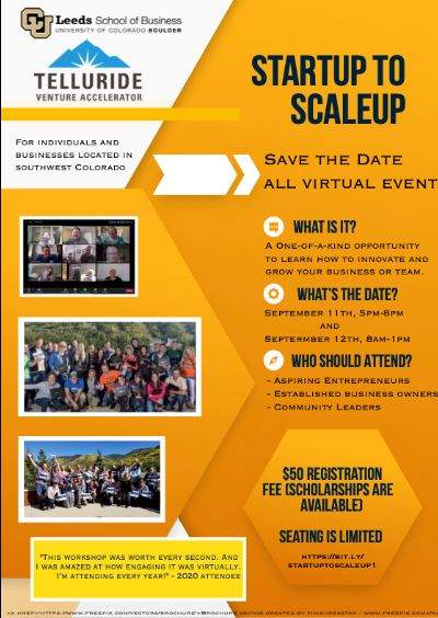 The Telluride Foundation’s Telluride Venture Accelerator and Colorado University, Boulder host third annual “StartUp to ScaleUp” event. The virtual workshop planned to grow businesses in Southwest, CO. Cost for the workshop is $50 with some scholarships available. Registration, zoom link information, scholarship information, and an agenda can be found here. Details below.