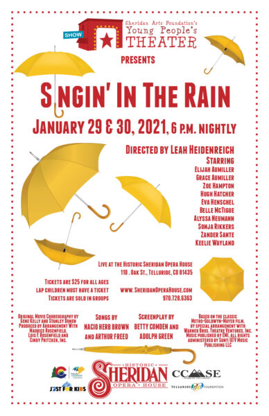 Telluride’s Sheridan Arts Foundation’ Young People’s Theater began its 22nd season with the holiday classic favorite, “A Christmas Carol.” The second of the three middle school winter productions is “Singin’ In The Rain.” That blockbuster comes to life at the historic Sheridan Opera House on Friday, January 29 and Saturday, January 30, 2021. Tickets are on sale now.