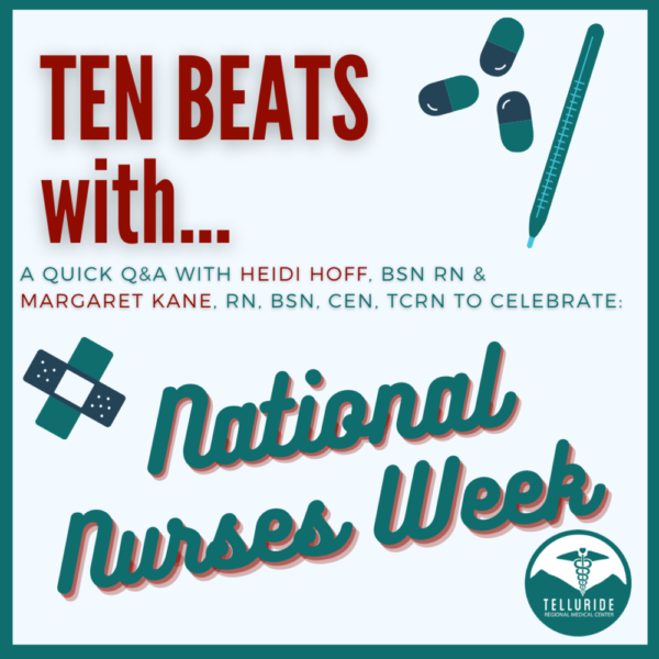 National Nurses Week continues through Wednesday, May 12. It’s a time to honor the commitment, dedication, and hard work of those in the nursing profession. Get to know two star nurses at the Telluride Med Center – Heidi Hoff, BSN, RN and Margaret Kane RN, BSN, CEN, TCRN – in the new feature “Ten Beats With …” column.