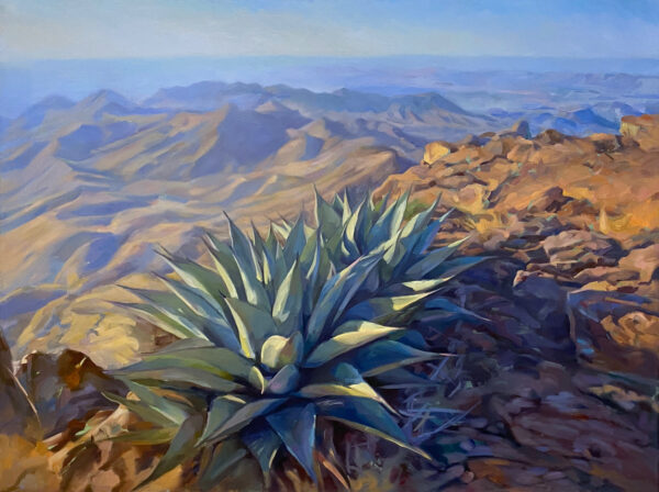 “This past year was devoid of people both physically due to the global pandemic – and in my paintings. I was also on faculty development leave from my professor position at Texas A&M in order to get some traction on this latest body of work. With my new-found flexibility, I took a class called ‘Our Moral Imperative’ from Baha’i educator, Adalia Ellis-Aroha. The course was designed to help white people understand the history and consequences of racial inequity in the United States. I was made aware of the colonizer mindset that sees people and the land as resources to be used, rather than our privilege to care for. On a personal level, I am interested in rooting out this colonizer mindset in myself in order to become a better steward of other people and the land. I am deeply concerned about humans current impact on the environment. I hope my new landscapes encourage people to find fascination with and care for the natural world.”