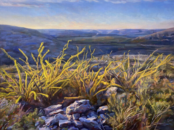 Taking her lead from the Group of Seven Canadian landscape artists and those affiliated with them, specifically Tom Thompson, House’s paintings use the idea of heightening the neutral colors and expansive space of the desert landscape to draw the viewer into a contemplative space. By using broken brush marks, Felice captures the ever-changing light that dances across mesas, rocks, and desert plants, thus providing a fertile ground for visual and spiritual exploration.