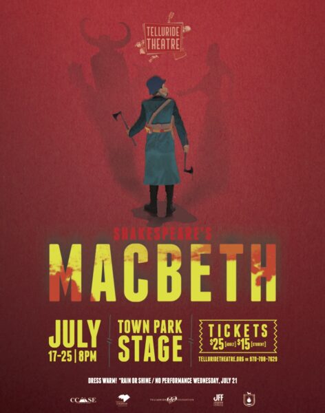 Telluride Theatre presents Shakespeare’s “Macbeth” for 2021 Shakespeare in the Park. July 17- 25 at 8pm. (No show Wednesday, July 21). Tickets, $25 (adults); $15 (children); FREE for all San Miguel County teachers and students. Tickets available here. Suitable for ages 13+. RAIN OR SHINE – audience is covered by Town Park stage, regardless, dress warm!