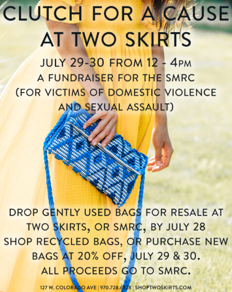 Two Skirts Telluride hosts “Clutch for the Cause,” a benefit for the San Miguel Resource Center. The event takes place Thursday and Friday, July 29 & July 30, noon-4 p.m. Drop gently used bags at Two Skirts or the San Miguel Resource Office, 301 So. Pine #102 by Tuesday, July 27. Bags are priced and resold to benefit the Telluride region’s only nonprofit targeting interpersonal violence. Kristin Holbrook is also offering 20% discount on new Two Skirts’ bags. Proceeds from those sales go to the Resource Center as well. And please remember to wear a mask – if you are not vaccinated.