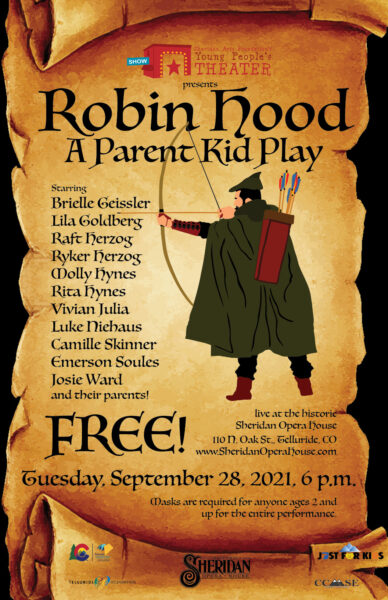 The Sheridan Arts Foundation’s Young People’s Theater proudly presents the seventh annual Parent/Kid play, a production of “Robin Hood.” The happening takes place Tuesday, September 28, 2021 at 6 p.m. The show is free – although donations are always welcome. No advance tickets are necessary, doors open at 5:30 p.m. Everyone ages two and up must wear a mask for the entire performance.