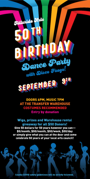 It’s Telluride Arts’ 50th birthday! Come celebrate and dance with Disco Fuego at the Transfer Warehouse on Thursday, September 9th! Doors 6pm; music 7pm. Entry by donation. Costumes recommended!