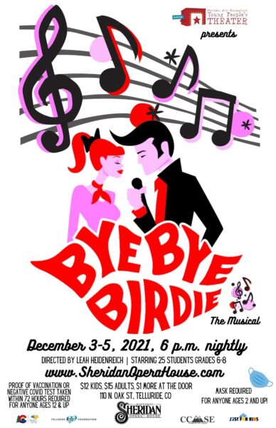 The Sheridan Arts Foundation Young People’s Theater kicks off its 23rd season with the middle school production of “Bye Bye Birdie.” The production is live at the historic Sheridan Opera House on Friday, December 3 through Sunday, December 5, 2021, 6 p.m. nightly. Tickets are $15 for adults; $12 for children 18 and under. Lap children are free. (Tickets are $1 more at the door to encourage people to buy in advance.) For tickets and more information visit www.SheridanOperaHouse.com or call 970-728-6363 ext. 5.