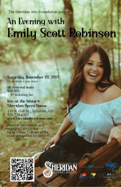 Telluride’s Sheridan Arts Foundation’s presents “An Evening with Emily Scott Robinson.” The concert takes place Saturday, November 20, 9 p.m. at the historic Sheridan Opera House. Tickets are $20-$25, all reserved seats, plus a $5 ticketing fee at all sales outlets at www.sheridanoperahouse.com.