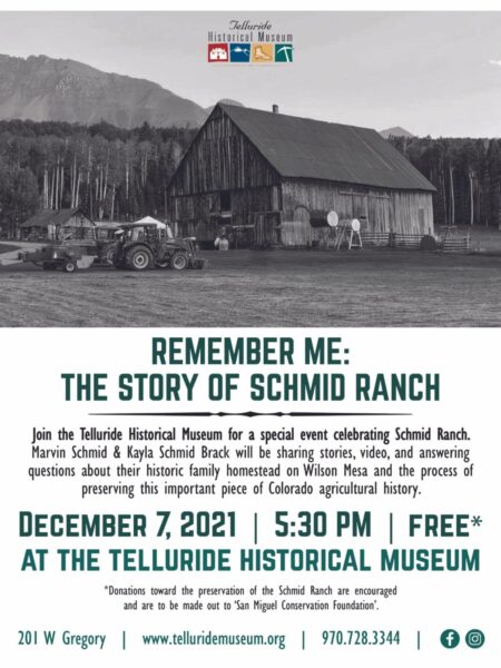 Join the Telluride Historical Museum for a special event celebrating Schmid Ranch. Marvin Schmid & Kayla Schmid Brack will be sharing stories, video, and answering questions about their historic family homestead on Wilson Mesa and the process of preserving this important piece of Colorado agricultural history.