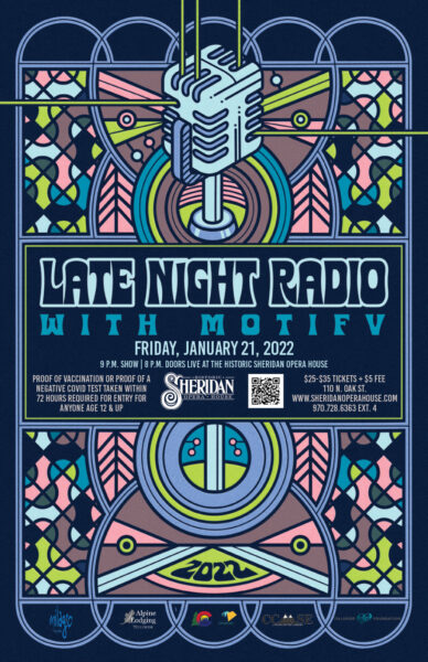 Telluride’s Sheridan Arts Foundation presents Late Night Radio with Motifv is live at the historic Sheridan Opera House on Friday, January 21, 2022 at 9 p.m. Doors open at 8 p.m. Tickets, $25 standing general admission; $35 reserved balcony seats+ $5 ticketing fee. Available at www.SheridanOperaHouse.com or by calling 970.728.6363 ext.4.