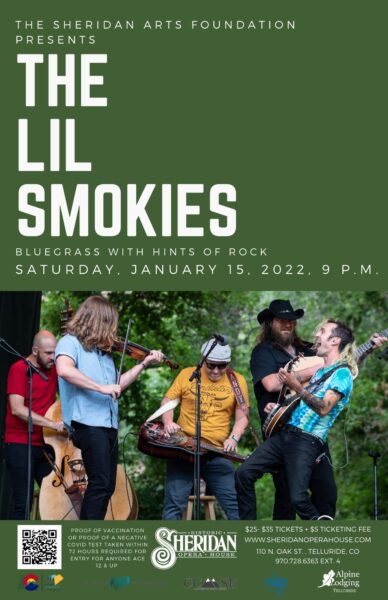 Telluride’s Sheridan Arts Foundation presents The Lil Smokies live at the historic Sheridan Opera House. Show time is Saturday, January 15, 2022 at 9 p.m. Doors open at 8 p.m. Tickets are $25 standing general admission;$35 reserved balcony seat tickets + $5 ticketing fee, available at www.SheridanOperaHouse.com or by calling 970.728.6363 ext. 4.