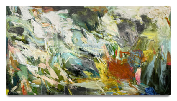 “‘Visual eavesdropping’ is a term I use to describe the process of being in a state of slow looking, when I become acutely focused and firing all my senses – not just sight, but sounds, smells, tastes, memories, dreams. Anything becomes fuel and inspiration for my paintings. Employing elements of gravity and chance that will help me share a personal experience or an internal narrative through a non-objective process so that it connects with the viewer in a visceral way.”