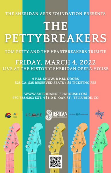 Telluride’s Sheridan Arts Foundation (SAF) presents the PettyBreakers, a tribute to Tom Petty and the Heartbreakers, live at the historic Sheridan Opera House (SOH) on Friday, March 4, 2022, 9 p.m. Doors open at 8 p.m. Tickets, $25 standing general admission tickets; $35 reserved balcony seat tickets + $5 ticketing fee, are available at www.SheridanOperaHouse.com or by calling 970.728.6363 ext. 4.