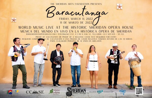 Telluride’s Sheridan Arts Foundation (SAF) presents Baracutanga in concert at the historic Sheridan Opera House (SOH). The show takeas place Friday, March 11, 2022, 9 p.m. Doors open at 8 p.m.