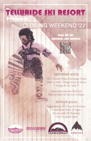 “We are very excited to bring back the pond skim after a two-year hiatus. Closing day is a big celebration here in Telluride. It is a great opportunity for everyone to get together and celebrate all of the hard work that went into the season,” Patrick Latcham, VP of Sales and Marketing for Telluride Ski and Golf.