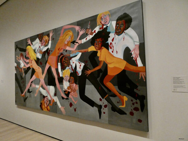 As the exhibition illustrates, Ringgold’s art and activism are inextricably bound. Her work confronted prejudice directly and makes political statements using the shock value of racial slurs within an image to highlight the ethnic tension, political unrest, and the race riots of the 1960s and 1970s, palettes and geometries adapted from sources as varied as African Bakuba textiles and the paintings of Ad Reinhardt. Each piece provides crucial insight into perceptions of white culture by African Americans – and vice versa. For example, the “stripes” is one painting spell out the slur “nigger.”