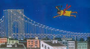 A story quilt titled “Tar Beach” features an urban rooftop commonly used as a place to escape the oppressive heat of an inner city without air-conditioning. Adults visit while kiddos play or sleep on blankets. A daughter dreams of flying freely over all barriers, represented by the George Washington bridge in the background.