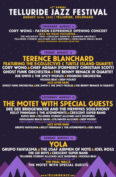 The Telluride Jazz Festival, now only 100 days away, takes place this year from August 12-14, 2022. The weekend presents a well-rounded mix of live jazz, funk, rock, soul, and gospel performances. This year the talent includes Yola, The Motet (With Special Guests TBA), Terence Blanchard Featuring The E-Collective & Turtle Island Quartet, Christian Scott aTunde Adjuah, Dee Dee Bridgewater and the Memphis Soulphony and many more. The complete list of announced artists is included below.