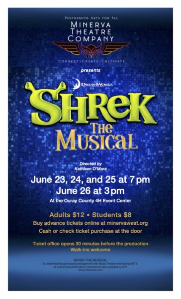 Shrek the Musical will run June 23-25 at 7:00 pm and June 26 at 3:00 pm, at the Ouray County 4H Event Center in Ridgway. Tickets, $12 for adults; $8 for students, are available online at minervawest.org. Tickets (cash/check only) will also be available at the door 30 minutes prior to the show on the day of the performance. For more information, info@minervawest.org