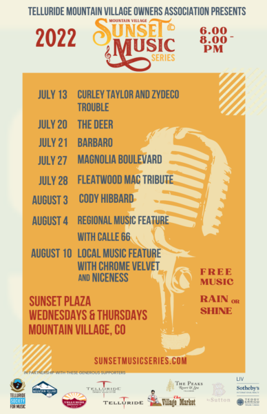 The Sunset Music Series is provided to the public free of charge by presenting sponsor TMVOA, as well as The Telluride Society for Music and The Telluride Ski and Golf Company. Supporting sponsors include Broker Associate Teddy Errico of LIV Sotheby’s International Realty, The Peaks Resort and Spa, By Sutton, Telluride Brewing Company and the Town of Mountain Village.