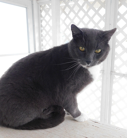 My name is Cosmo, and I am one of the longest-term residents here at Second Chance. I have no idea why my people have not found me yet. I’m a big guy (no fat-shaming, please), and I have beautiful soft gray and white fur. I love everyone and am happy to sit and look out the window, lounge in the catio, sleep in my bed, or gaze lovingly into your eyes. Additionally, I am skilled at preparing astrological readings.