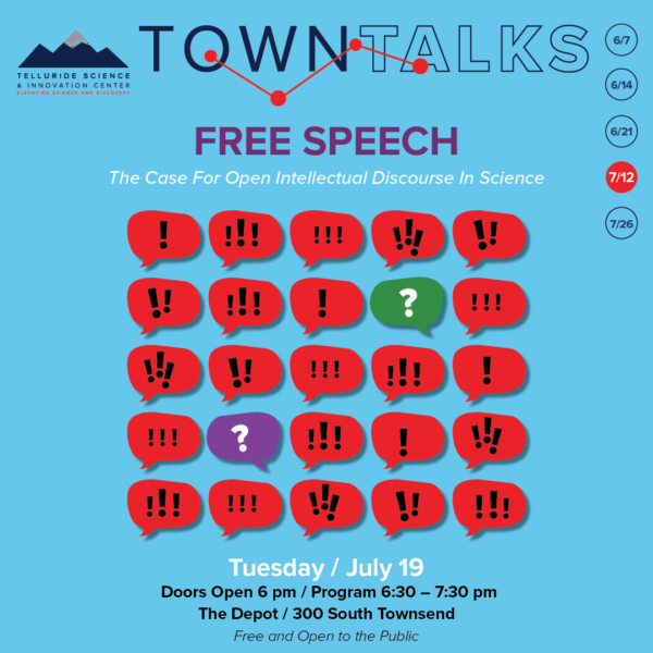 Telluride Science tackles a tough and timely topic this week. Just raising the issue of freedom of speech in academia elicits immediate and visceral responses, often with reactive assumptions of the perspectives of others. There is hesitancy to speak about the issue publicly because of fears of reprisals and misunderstanding.