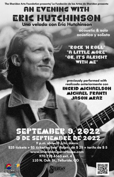 Telluride’s Sheridan Arts Foundation presents An Evening with Eric Hutchinson on Friday, September 9, 2022 at 9 p.m. Doors open at 8 p.m.