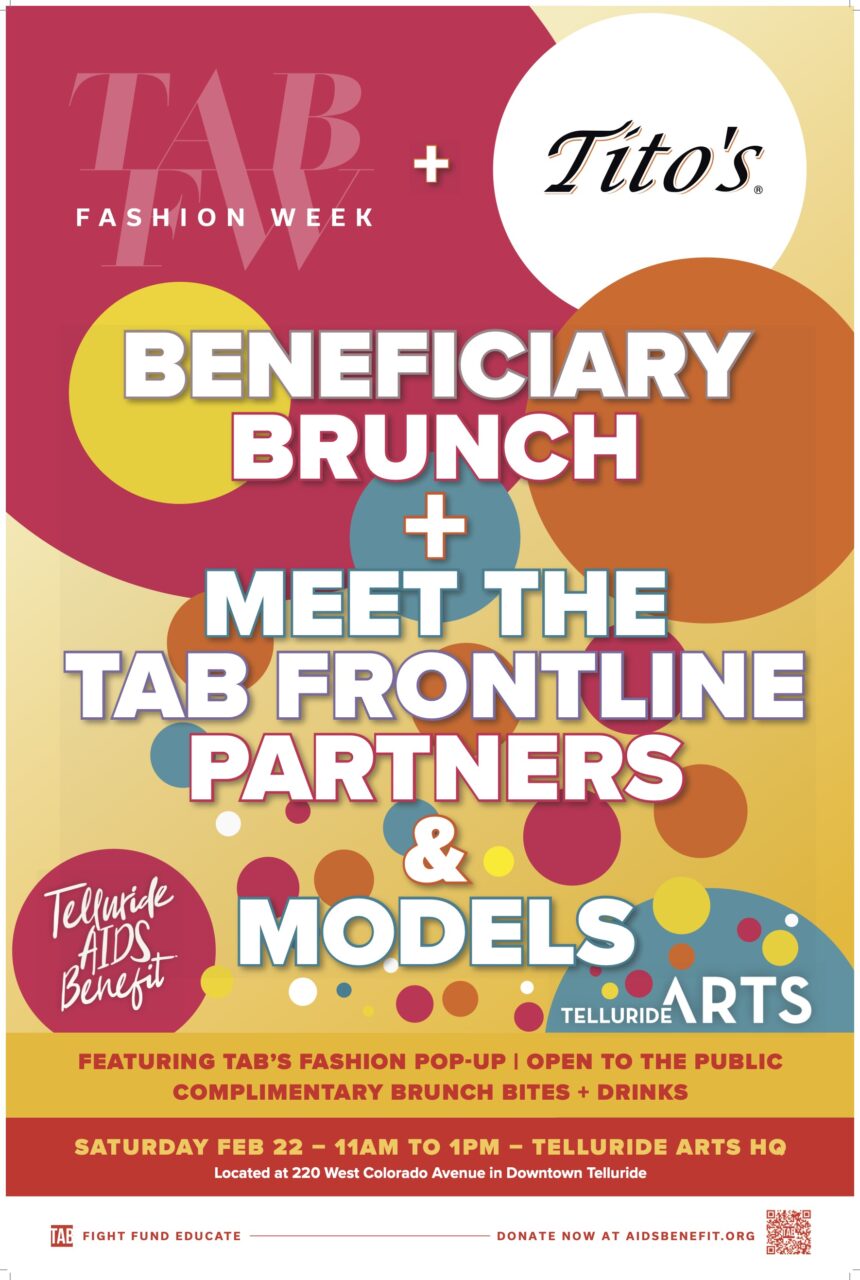 Join TAB at Telluride Arts HQ for our annual complimentary brunch! Rub shoulders with fabulous models and connect with frontline partner organization representatives from all over Colorado. Enjoy Tito’s sponsored cocktails, delightful brunch offerings, and shop with fashion partners! Discover more about TAB’s mission from those we serve.
