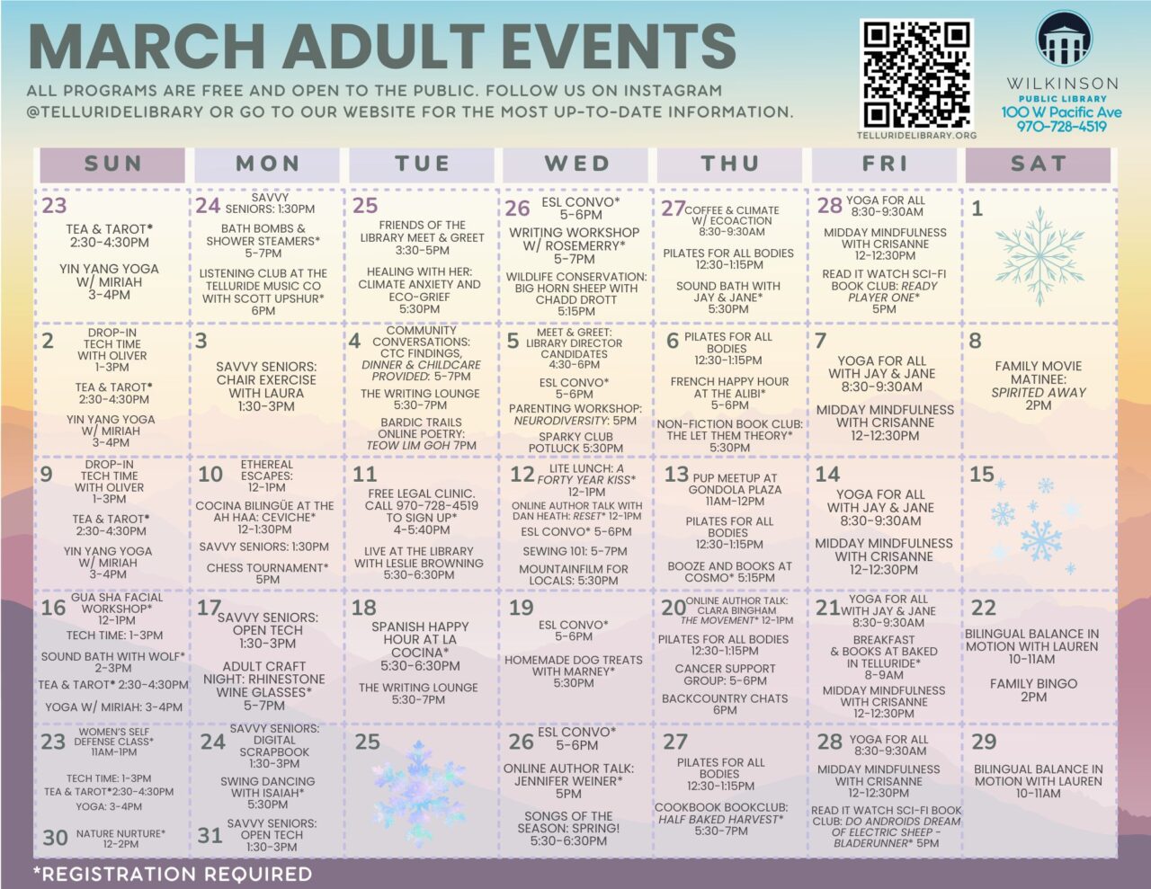 Telluride’s Wilkinson Public Library announces its March schedule for adults and children.