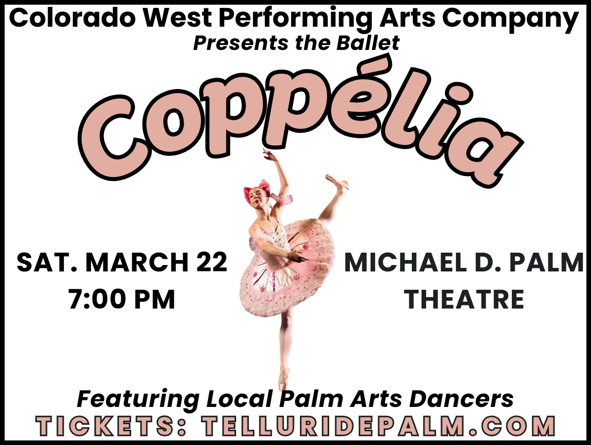 Colorado West Performing Arts Company will perform “Coppélia” at the Michael D. Palm Theatre. The happening takes place Saturday, March 22 7pm.; doors open at 6:30pm. Concessions will be open.