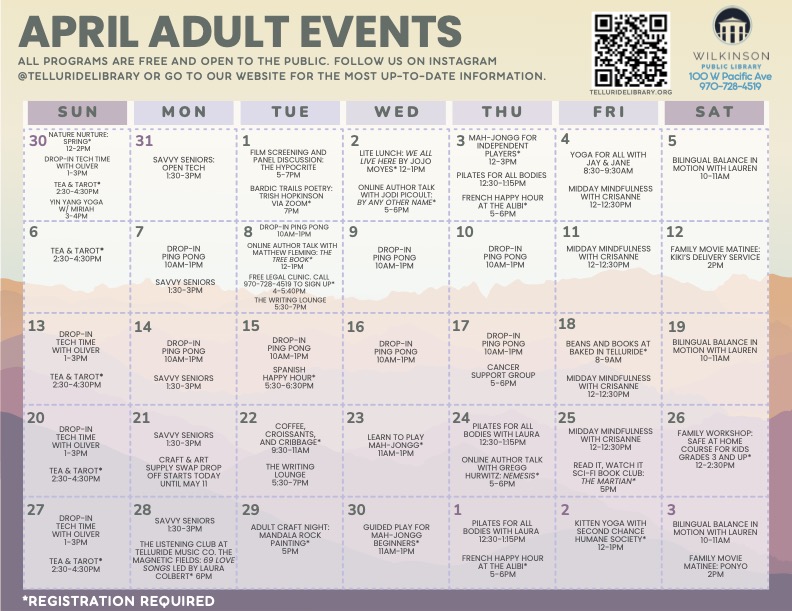 Telluride’s Wilkinson Public Library announces its April schedule for adults and children.