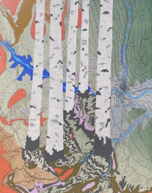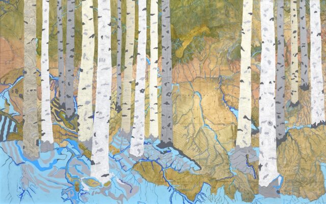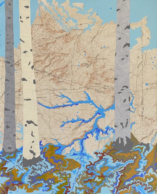 Launched in 2021, Nemirov’s “Rivers Feed the Trees” series is an ongoing body of work that imagines an American West free from drought. In a collaboration spanning over 100 years, Nemirov paints a network of branching, intertwining waterways into the topography of maps from the early 20th and late 19th centuries.