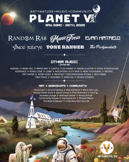 PlanetV was founded in 2020 as an impromptu gathering of 75 friends seeking connection during the COVID-19 pandemic and has grown into an independent, three-day festival led by a passionate group of friends from the Telluride and Burning Man communities. This year, PlanetV promises to bring inspiration and opportunities for learning and connection! Headlining this year are Random Rab; Manic Focus; Evan Hatfield; Tone Ranger; and The Pickpockets, with more creatives in the line-up to come.