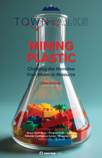 This coming week the 2025 Telluride Science Town Talks series begins with “Mining Plastic: Changing the Narrative from Waste to Resource.” The event takes place Tuesday, June 3, 6:30 pm, doors, 6 p.m., at the Telluride Conference Center in Mountain Village. Town Talks are FREE and open to the public.
