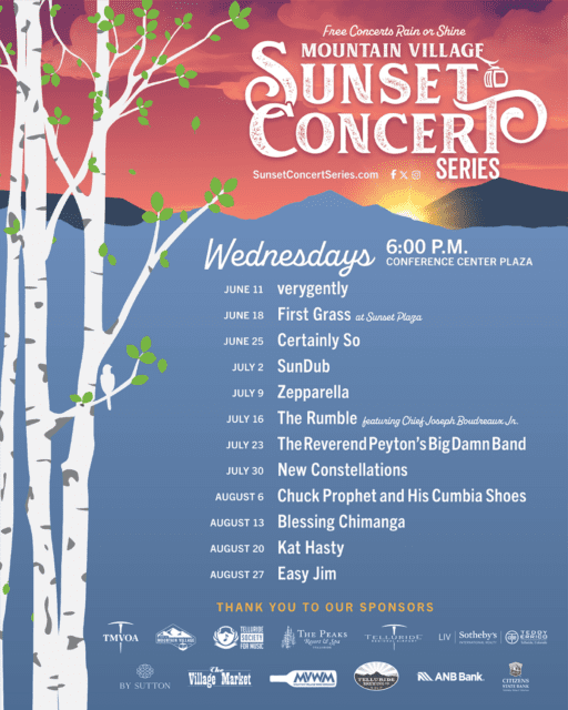 The Sunset Concert Series is presented by TMVOA, The Telluride Society for Music and the town of Mountain Village,. Supporting sponsors include Citizens State Bank, The Telluride Regional Airport, The Market at Mountain Village, ANB Bank, Trusted Advisor Teddy Errico of LIV Sotheby’s International Realty, The Peaks Resort and Spa, By Sutton, and Telluride Brewing Company. The event is held rain or shine.