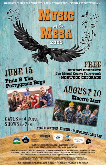 Music on the Mesa (MotM), the free concert series in Norwood, is now in its second year. Below announcing the lineup for the two shows at the San Miguel County Fairgrounds, June 15 and August 10.